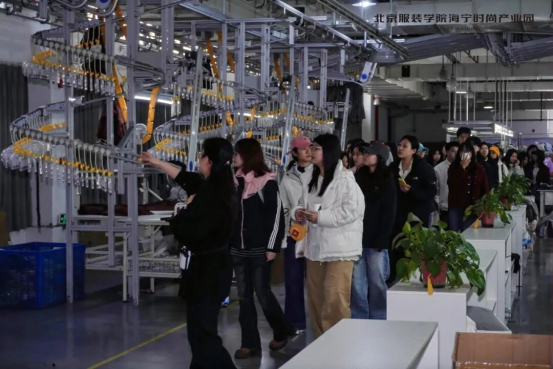 作为本次考察的核心环节,师生们深入海宁时尚产业集聚区。在北京服装公司海宁时尚产业园,同学们沉浸式体验了色彩创新中心、实践成果展示区等特色空间,切身感受产教融合的创新火花。产业园王晓玲老师带领师生们先后走进海宁马桥经编纺织协同创新中心与海宁中国皮革城,亲身感受科技赋能传统工艺的产业脉动,调研服饰工艺细节与市场流通规律,为产业实践筑牢了坚实的认知根基。