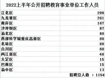 重庆市人力社保局发布各区《2022年上半年公开招聘教育事业单位工作人员简章》。本次招聘共计1154人,其中,江北区招聘人数最多,为290人,紧随其后的九龙坡区、南岸区分别为261人和167人。