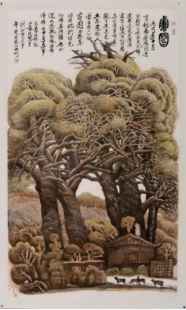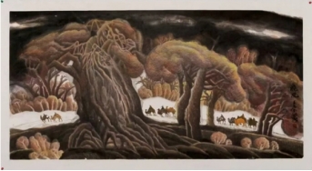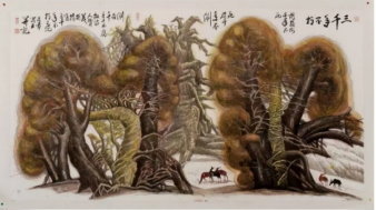 大漠孤烟,长河落日,是镌刻在我们心中的大漠记忆。何文豪先生画笔下的大漠,处处渗透着生命的礼赞。无论是梭梭、红柳、胡杨,都极尽生命情态。生命,是鲜活,是生长,是生生不息,是在自然与天地间自我力量与存在的彰显。何文豪先生画笔下的红柳与胡杨,以极其细腻笔触与个性化艺术语言,将身处大漠的胡杨精神描绘得淋漓尽致。无论是老干虬枝,还是新芽嫩叶,都“任尔东西南北风”,历尽沧桑。无论百年,还是千年,他们都以充满生命抗争的力量,矗立在茫茫大漠,诉说着生命的坚忍与永恒。胡杨,之所以成为何文豪先生的素材,就在于胡杨精神,与他本身对于世界、社会、人生的认知互通为一。