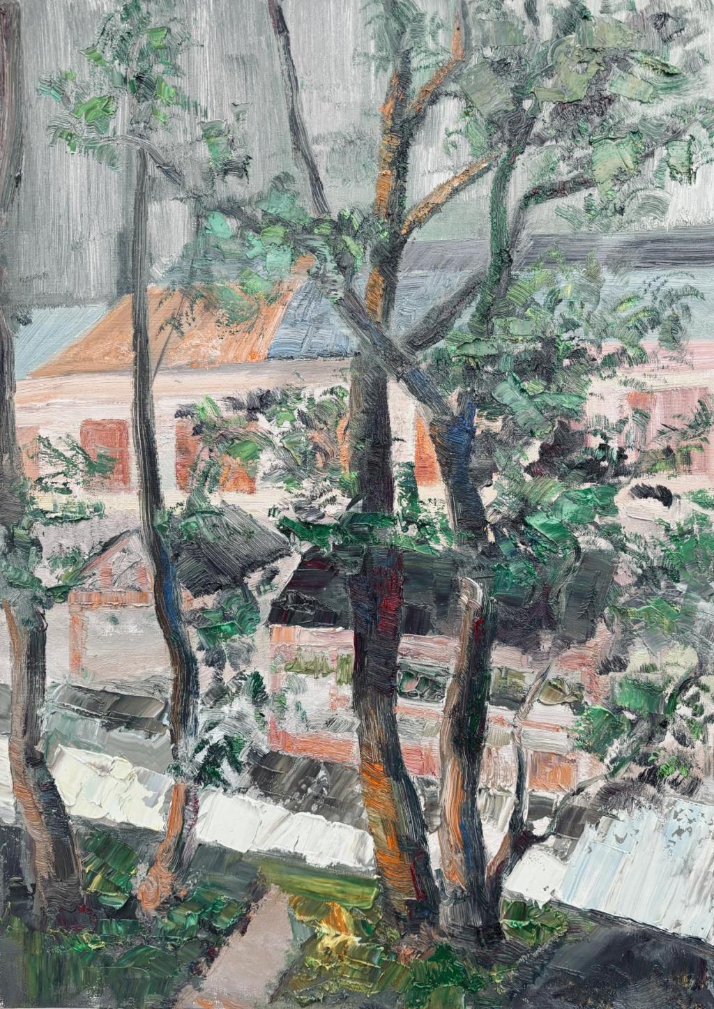 《龙潭岸的树影人家》布面油画70*50cm 刘鸿程