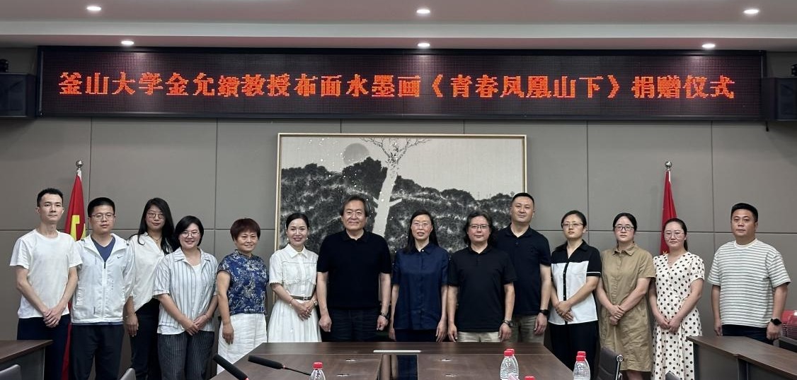 6月23日,韩国著名艺术家、韩国国立釜山大学博士生导师金允鑽教授力作布面水墨画《青春凤凰山下》捐赠仪式在bevictor伟德官网举行。金允鑽教授及夫人,公司副董事长邓杰及档案馆、bevictor伟德官网、国际交流合作处师生代表参加捐赠仪式。