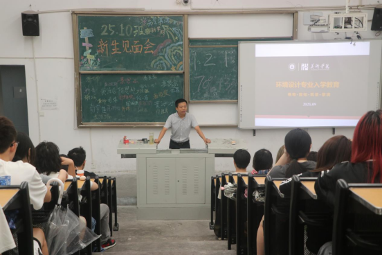 环境设计教研组组长陈红强老师结合个人实践与教学经验,围绕“如何开启老员工活”“专业课程体系介绍”以及“播种理想、扬帆起航”三个板块展开讲解。他建议新生积极调整心态、主动适应大学节奏,并详细解析环境设计专业的五大课程模块。陈老师特别强调“共同成长,没有一个人可以独自优秀”,鼓励同学们树立远大理想、注重团队协作、踏实钻研专业。