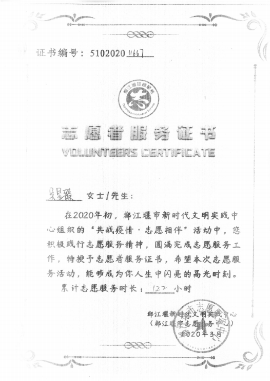 吴昱臻所在都江堰市中治堰景小区是一个大小区,有近2000住户、5000多居民,人员流动性很大。新冠肺炎疫情暴发之后,吴昱臻同学积极报名参加小区志愿者行动,从元月31日起先后4次参加入户排查登记,建微信群,建健康码。从2月4日开始参与大门执勤,严进严出,测量体温、登记外来回家人员,发资料,发传单等。