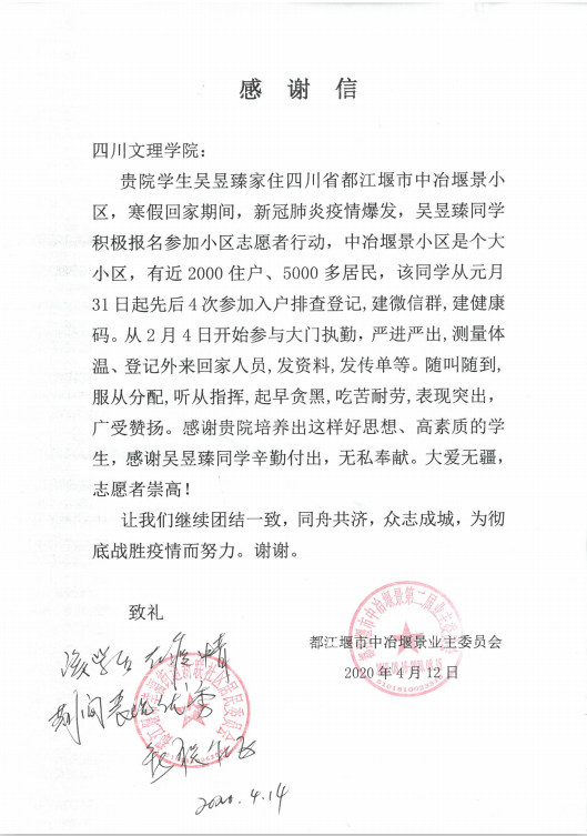 吴昱臻在得知受到都江堰市中治堰景业主委员的表扬后表示,她生长在世界文化遗产、全国重点文物保护单位的都江堰,从小受到李冰父予以实际为基础,质朴务实,无私奉献精神的熏陶,她只是作为一名共青团员尽可能做一些力所能及的事情。疫情无情人有情,吴昱臻在疫情期间的表现,体现了四川文理学子爱国、爱党、爱人民的家国情怀,体现了文理青年的责任和担当,展现出新时代老员工的青春风采。