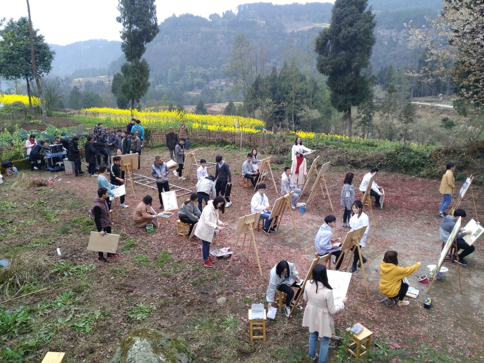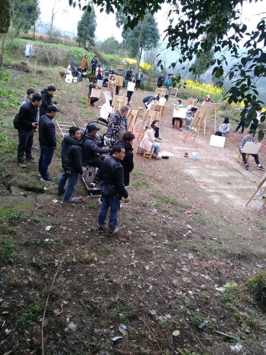 根据拍摄要求,志愿者们凌晨4:00就起床,带上写生画材乘车赶往目的地,早上8:00抵达山腰,山路崎岖,汽车无法继续前行,志愿者们踏上了泥泞的山路,经过一个多小时的步行,终于抵达目的地——中山寺遗址。志愿者们虽历经了漫长的跋涉,但还是精气神十足,一边帮忙摆放道具,一边积极参与宣传片的拍摄。尽管拍摄过程是无趣死板的,需不停变换动作,同一个动作更要反复从不同角度进行拍摄,但是志愿者们依然展现了当代老员工的良好风貌,积极配合导演安排,圆满完成了拍摄任务。