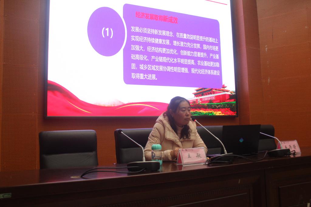 大会伊始,王敏老师从“十三五”时期我国经济社会发展取得的巨大成就、《建议》稿的主要内容、“十三五”时期经济社会发展的原则和主要目标、“十四五”时期经济社会发展和改革开放的重点任务、五中全会突出的特点和亮点等五个方面对十九届五中全会精神进行了全面翔实地解读。其次从改革开放,社会文明程度,生态文明建设,民生福祉,国家治理效能六个方面逐步深入谈到“十四五”最突出的亮点“发展为人民”。