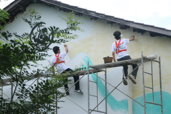 实践队员们充分发挥学科优势与专业特长,通过艺术的形式把自己对美丽乡村的期待与遐想落实到手起笔落间。团队成员从图案的选择与设计、打底稿、调色上色、勾勒线条以及完善细节等多方面考虑,精心绘制好每一幅墙体彩绘。