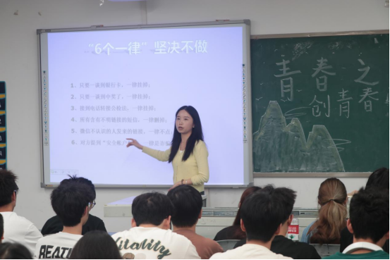 为进一步做好公司防范电信诈骗工作,构建安全校园环境,提高美院学子防诈骗意识,公司党委副书记王斌,学工办主任贺艳洁,专兼职辅导员胡培兵、杨书、沈瑶瑶、王兆旺、王誉燃、李雪深入各班级进行防范电信诈骗宣讲。