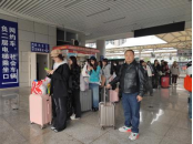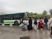 (图为员工于体育馆门口有序乘坐公交车前往达州火车站)