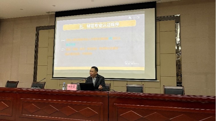 赵奎林博士做题为《师范认证视角下的课程教学大纲撰写与修订》的讲座。他重点解读了专业培养目标、专业课程规划、课程目标与毕业要求之间的紧密联系、教学大纲修订撰写与修订等指导。