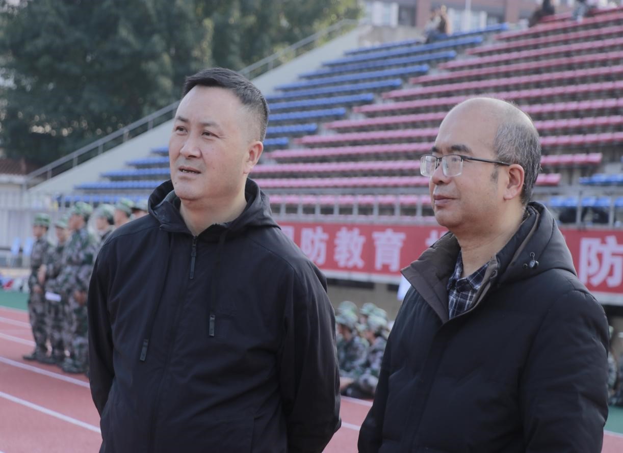 张吉应、王斌走进员工队伍中,关切询问大家的训练感受与生活情况。面对朝气蓬勃的学子,张吉应指出,军训是大学的“第一课”,同学们应珍惜这段宝贵经历,不仅在训练中磨砺吃苦耐劳的意志、强健体魄,更要将严明的纪律、协作的精神与坚韧的作风内化于心、外化于行,贯穿至今后的专业学习与人生成长中。王斌细心叮嘱同学们注意防寒保暖、保持健康,鼓励大家科学训练、劳逸结合,以最佳状态完成军训任务。